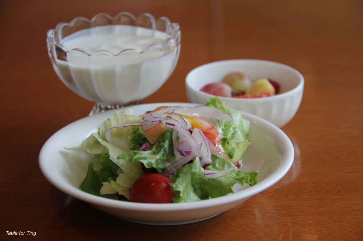 November 13, 2013 IMG_5552 copy Lovely salad with wafu sauce dressing accompanied with yogurt (totally tasteless, not my kind of food) and fruits. Healthy start for the day!