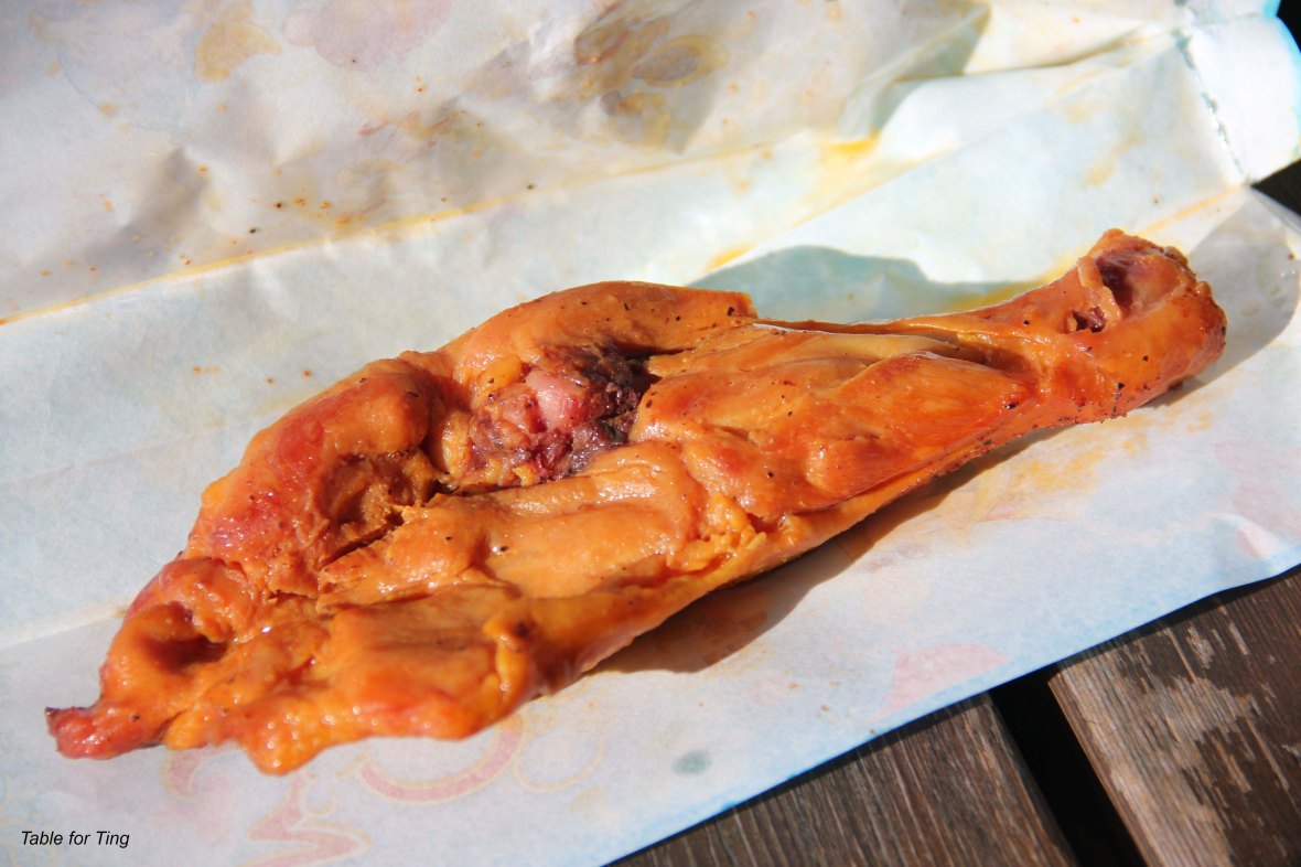 November 13, 2013 Smoked chicken leg (500Yen = SGD6.30) Smoked chicken leg. Looks really unappetizing. Tastes alright, it little on the oily side. This can be found at the Indian Jone ride. I would rather eat the smoked turkey leg.