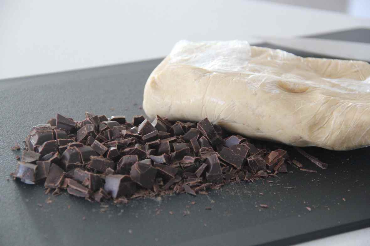 Take the dough out from the refrigerator and chop up the chocolate chunks.