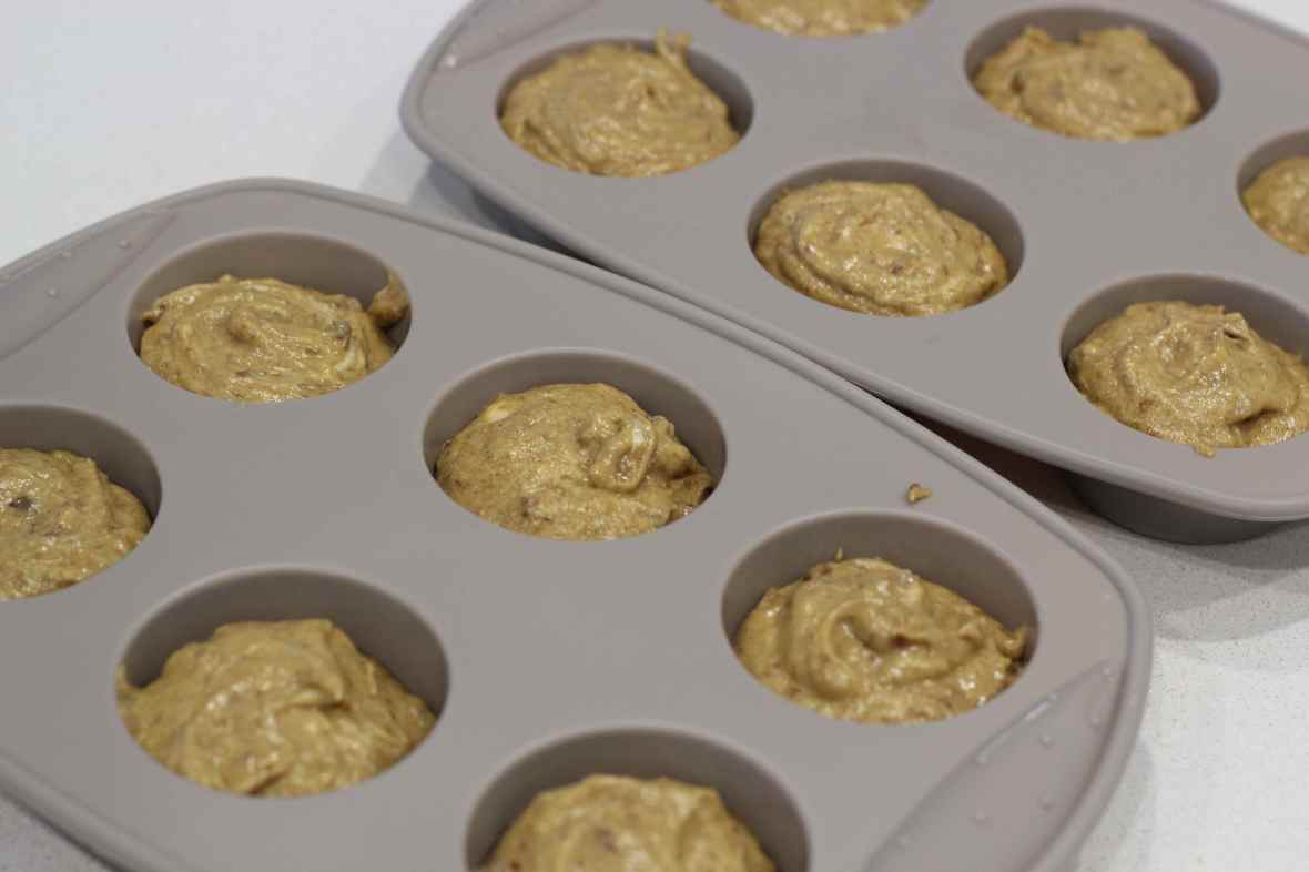 March 20, 2015 IMG_9225 Spread it evenly across 12 silicon muffin trays and place it in the oven to bake for 20min or when it turns brown