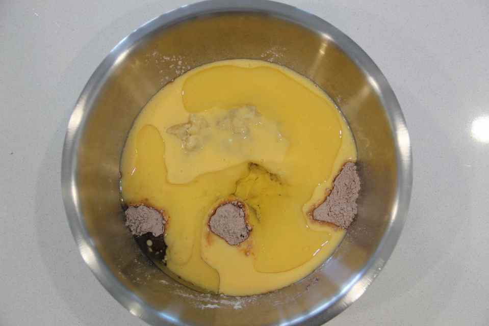 Tip the mixture of yoghurt into the dry ingredients with the grape seed oil.