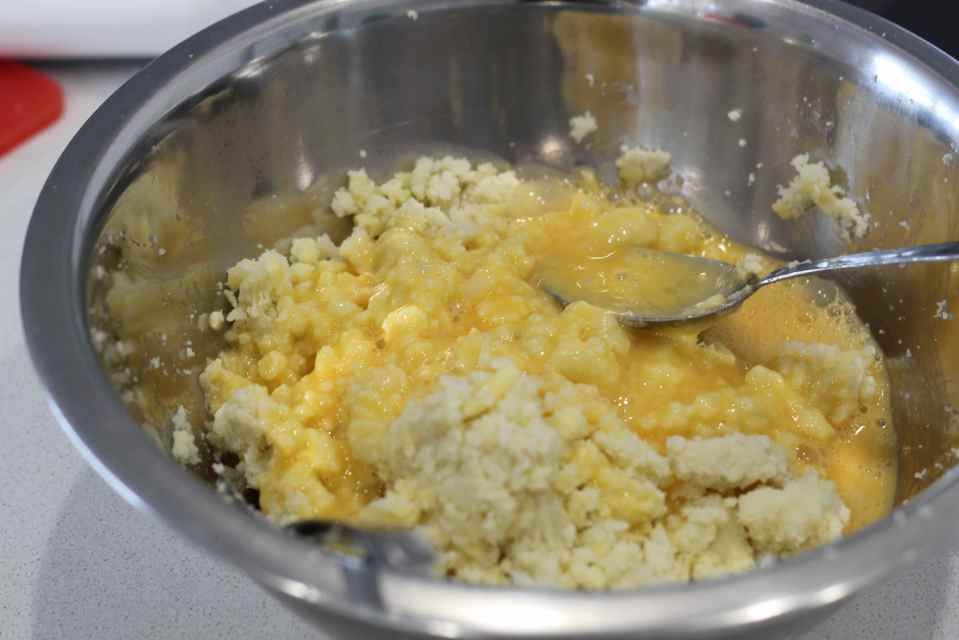 May 17, 2015 IMG_9966 Place the dried cauliflower into a mixing bowl. Add in the cheddar and 2 beaten eggs. Mix it well.