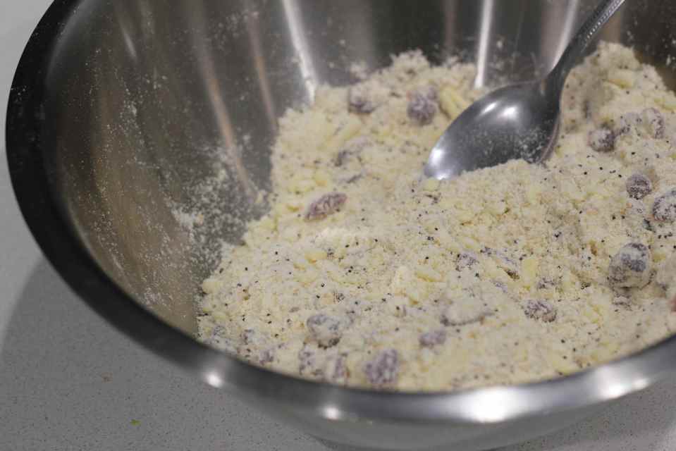 June 10, 2015 IMG_0069 Stir in the sugar, cheddar cheese, cranberries, poppy seeds and sesame seeds into the mixture.