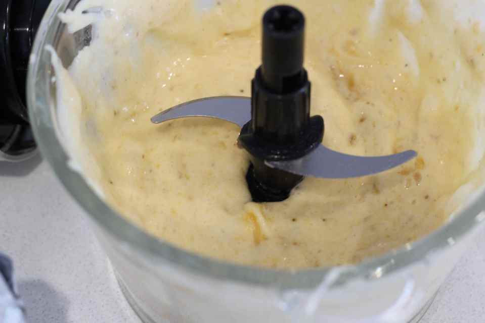 October 6, 2015 IMG_1328 While the eggs and sugar are being whisked, mash the bananas using a fork or a food processor