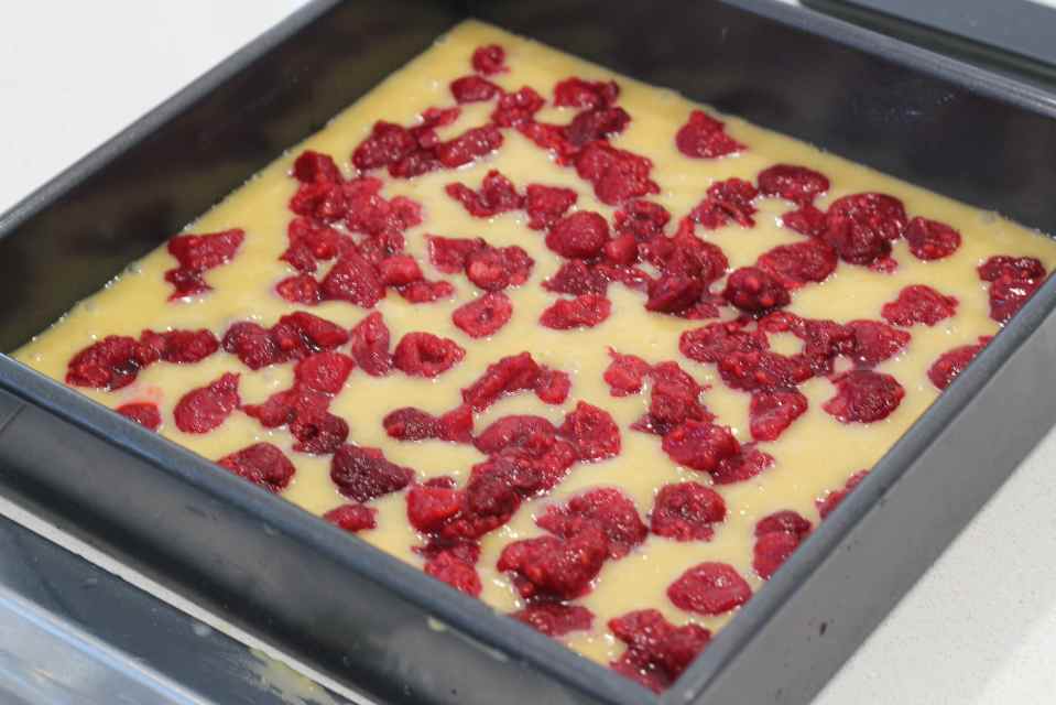 Sprinkle raspberries on the top of the cake mixture.