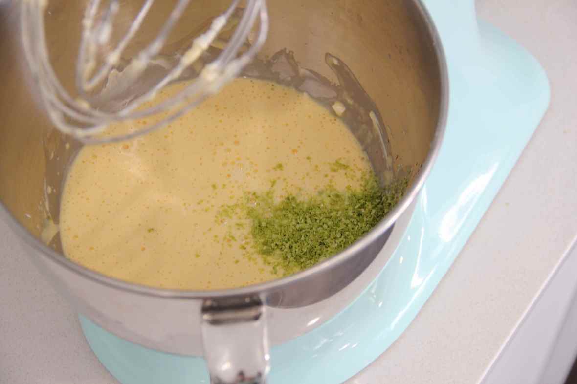 April 15, 2016 IMG_2799 Once the cream cheese is smooth, add in 5 egg yolks and continue to whisk it at high speed. Once the mixture is done, add in the condense milk, lime juice and lime zest.