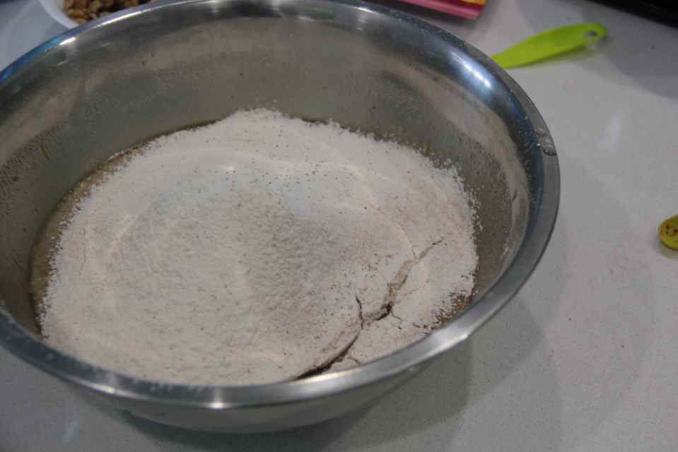 Sieve the dry ingredients into the wet ingredients