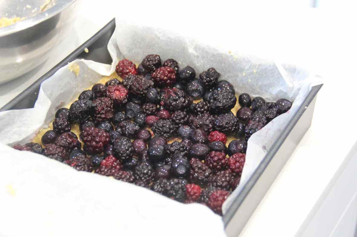 Add the black currents and blue berries on top of the bottom layer
