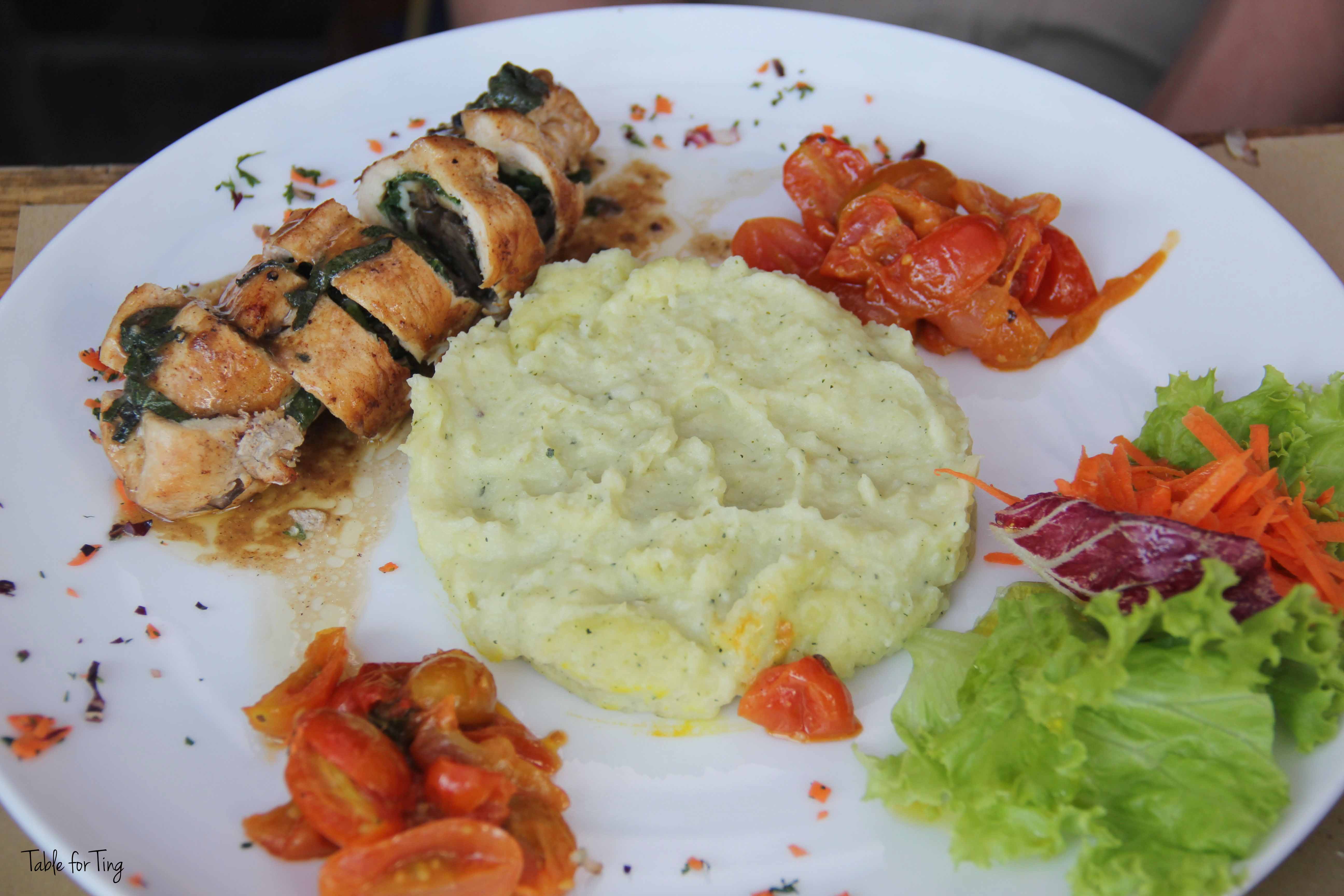 July 7, 2014 IMG_0720 copy Suprema di pollo – Sautéed chicken breast stuffed with emmental cheese mushrooms & fresh spinach, with mashed zucchini potatoes & sautéed cherry tomato