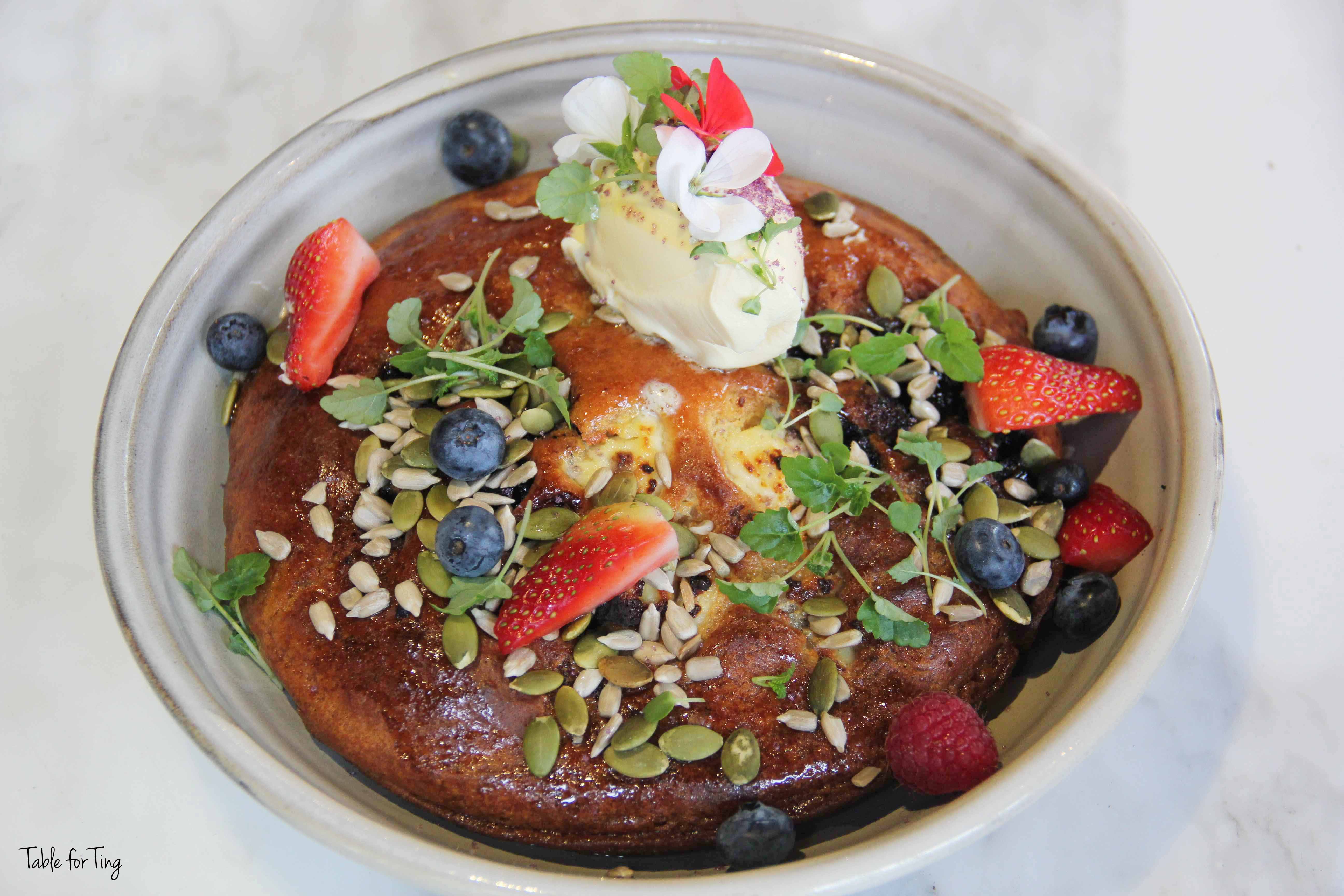 August 1, 2014 IMG_1065 copy Blueberry & ricotta hotcakes with berries, organic maple, seeds and double cream